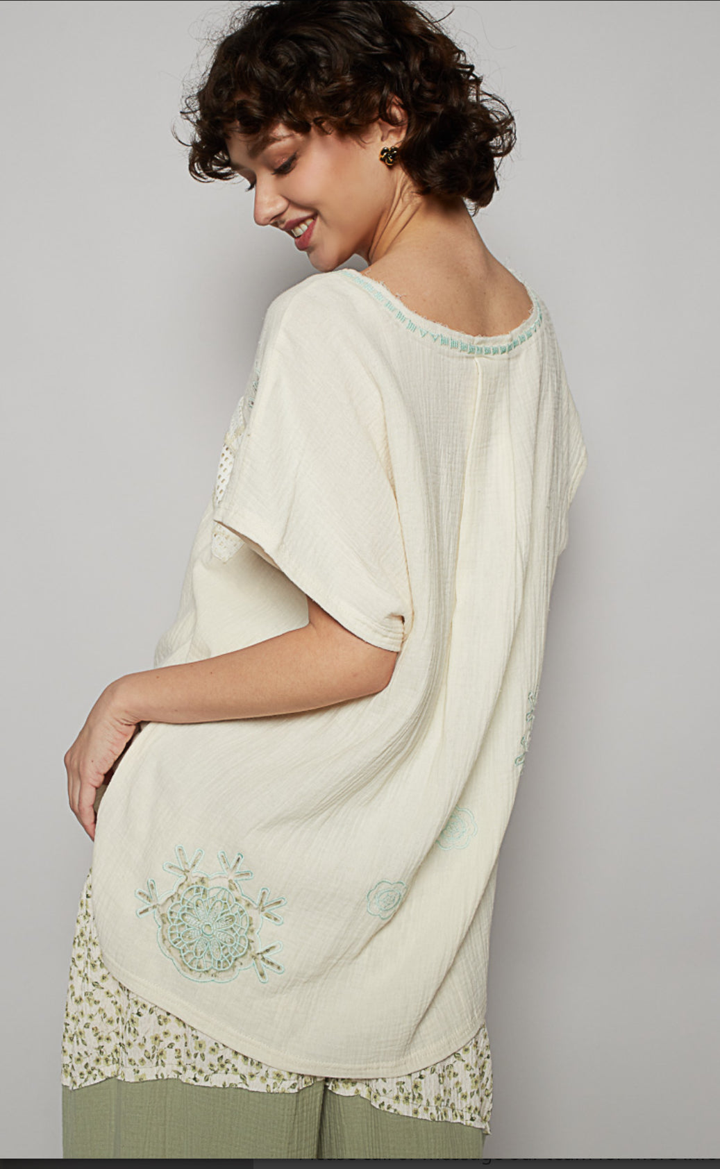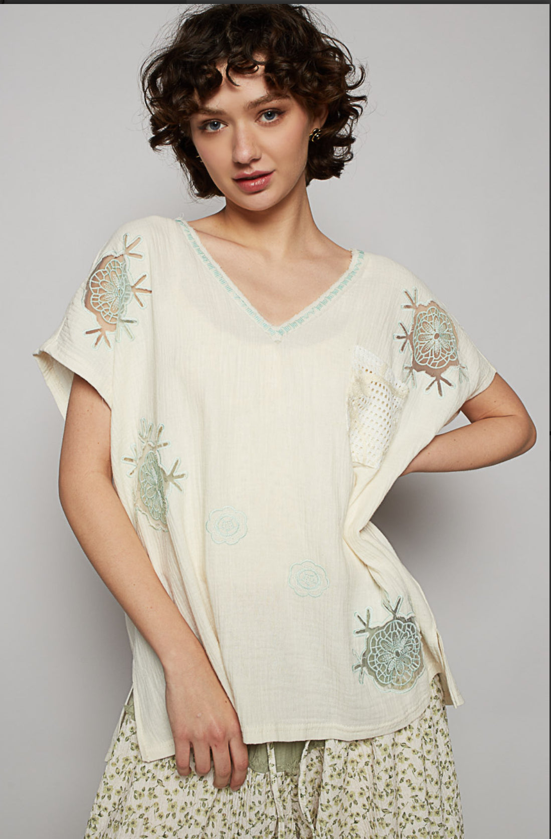 Boho meets artisan in The Ezra Top. This creamy ivory beauty features intricate embroidery, peekaboo lace accents, and a relaxed v-neckline. The flowy fit gives it movement and ease, while the delicate stitching brings in those handcrafted details that make it truly special.