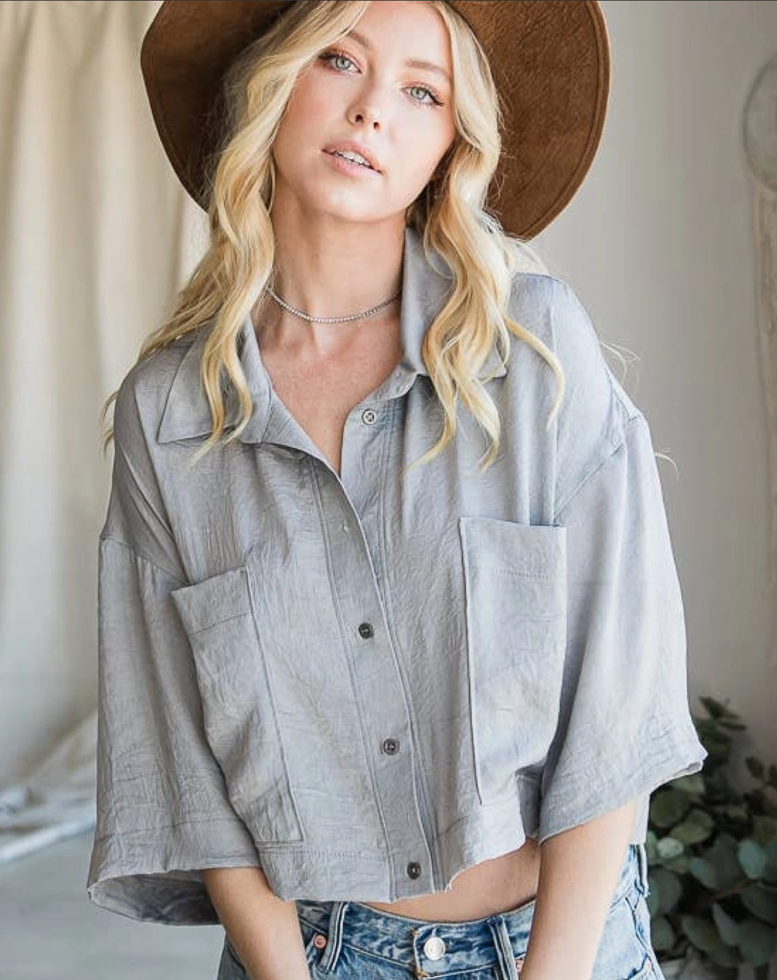 Faye, a cropped and boxy button down with a sleek design. Its cropped length gives a modern twist to the classic button down, while its boxy fit adds comfort and versatility. A perfect addition to any wardrobe. Color is blue
