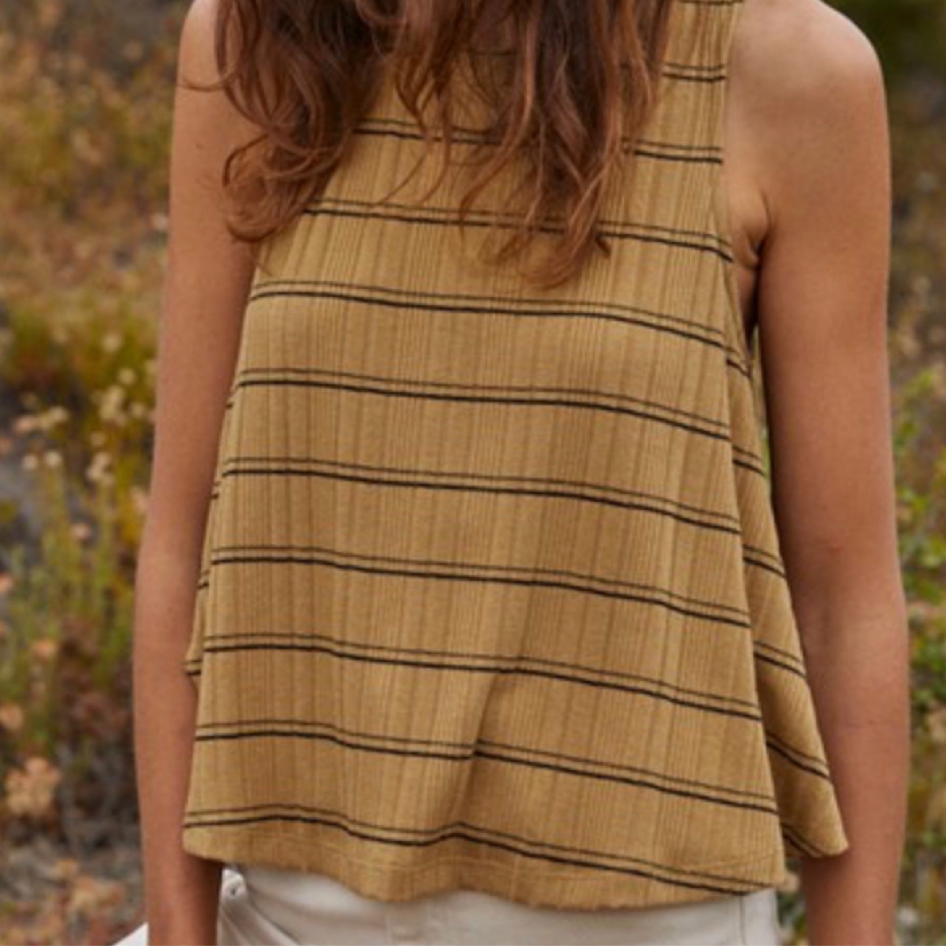 This earthy mustard tone and minimalist stripe design, this relaxed-fit tank captures the essence of boho style. The flowy silhouette and lightweight fabric make it an easy-to-wear piece, whether you’re out exploring or lounging in the sun.